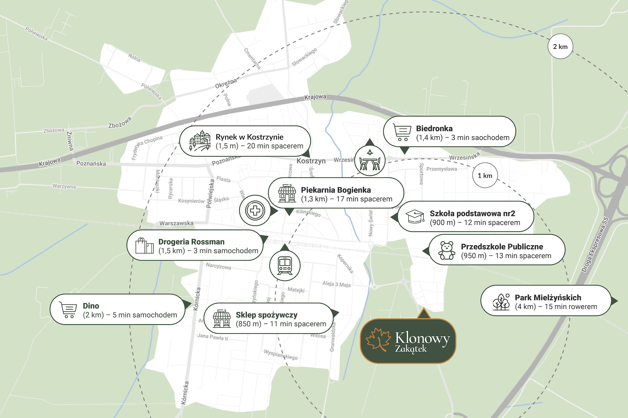 W Klonowym Zakątku, zlokalizowanym w Kostrzynie Wielkopolskim przy ul. Klonowej, zyskujesz czas, który możesz poświęcić rodzinie i sobie. Wystarczy 25 minut, by dojechać do samego centrum Poznania – bez korków, bez stresu. Bliskość drogi ekspresowej S5 i krajowej nr 92 sprawia, że szybko dotrzesz nie tylko do stolicy Wielkopolski, ale też do Swarzędza, Wrześni czy na trasę w kierunku Gniezna. Masz też opcję wygodnego dojazdu koleją – dworzec w Kostrzynie znajduje się niecały kilometr od osiedla.